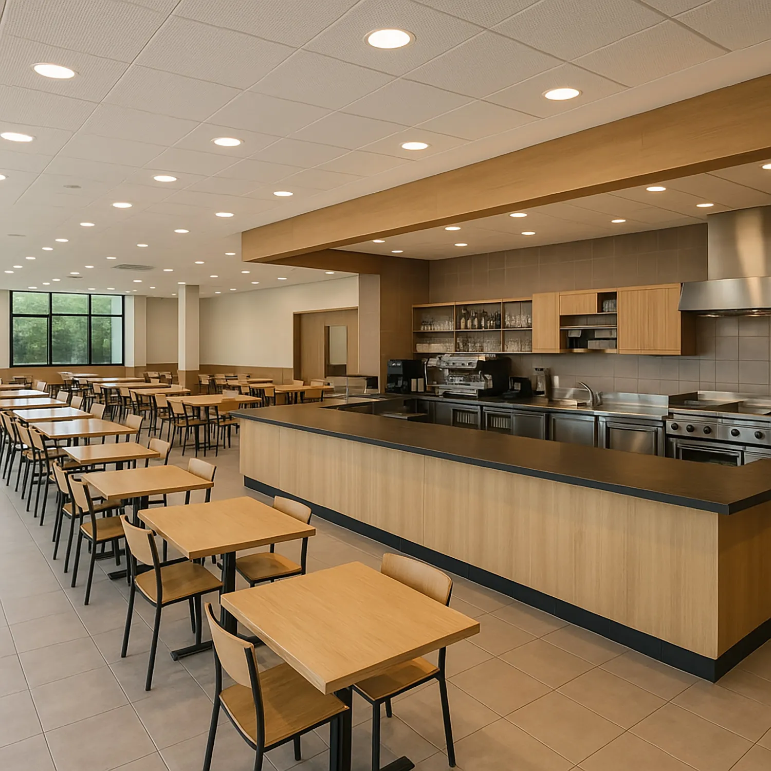 Comedor-cafetería → de una superficie aproximada de 800 m2, estará dotada de cocina, barra y zona de mesas.